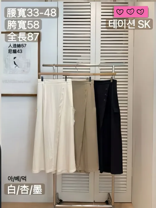 平量尺寸:腰寬33-48 臀寬58 長87 超級顯瘦:這件裙子剪裁超讚,寬版設計直接修飾下半身線條,顯瘦效果一流! 多種穿法:不對稱的裙襬設計超有特色,可以扣上或放下來,隨心所欲變換風格。 舒適好穿:鬆緊腰圍設計不勒肚子,彈性超好,吃飽飯也不怕!而且材質輕盈又透氣,夏天穿也不會悶熱。 穿搭小心機 日常休閒:搭配一件簡單的素T或貼身上衣,再踩上小白鞋,舒服又好看,逛街約會都適合! 上班族穿搭:上身換成襯衫或針織衫,再配雙跟鞋,馬上變身韓系小姐姐,專業又時尚! 約會穿搭:搭上蕾絲上衣或雪紡上衣,氣質直接破表,絕對讓男友眼睛為之一亮! 這件裙子真的可以從夏天一路穿到秋天,CP值超高!