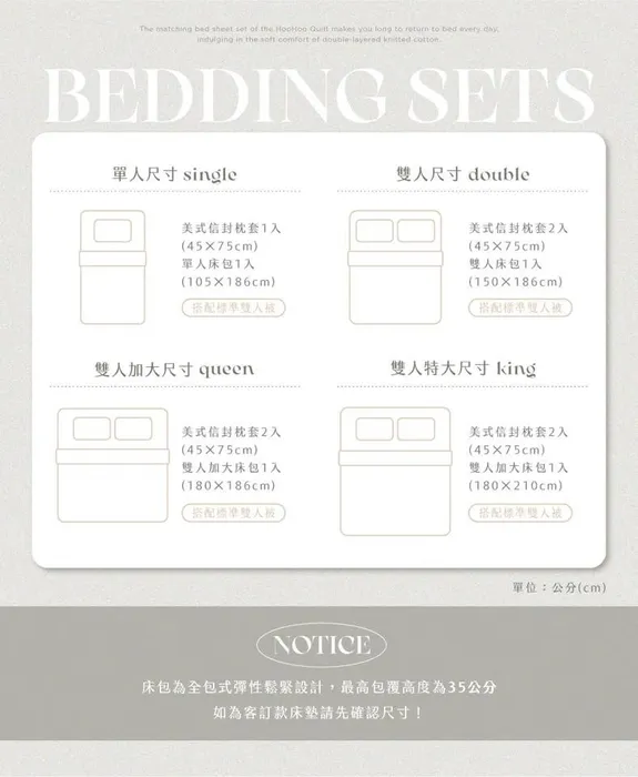✦ 床墊尺寸:單人(適用單人加大)、雙人、雙人加大、雙人特大