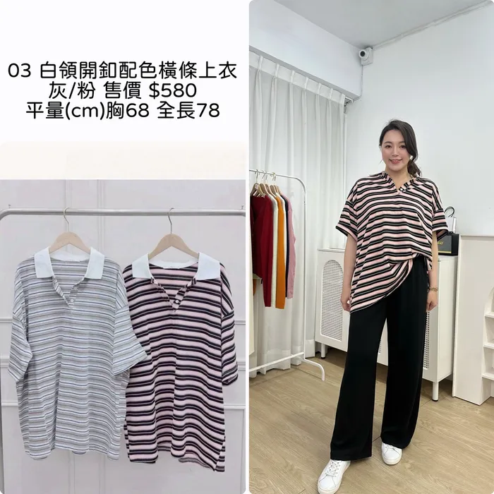 VI03白領開釦配色橫條上衣