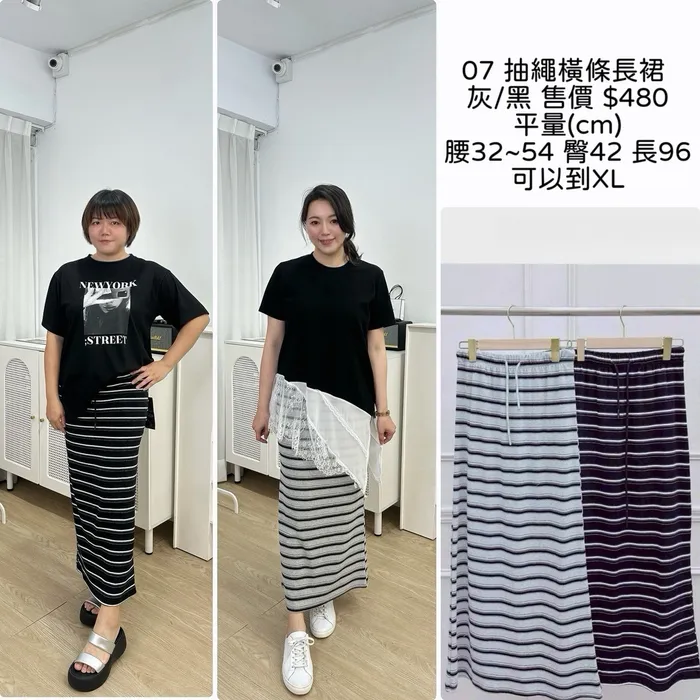 VI07抽繩橫條長裙