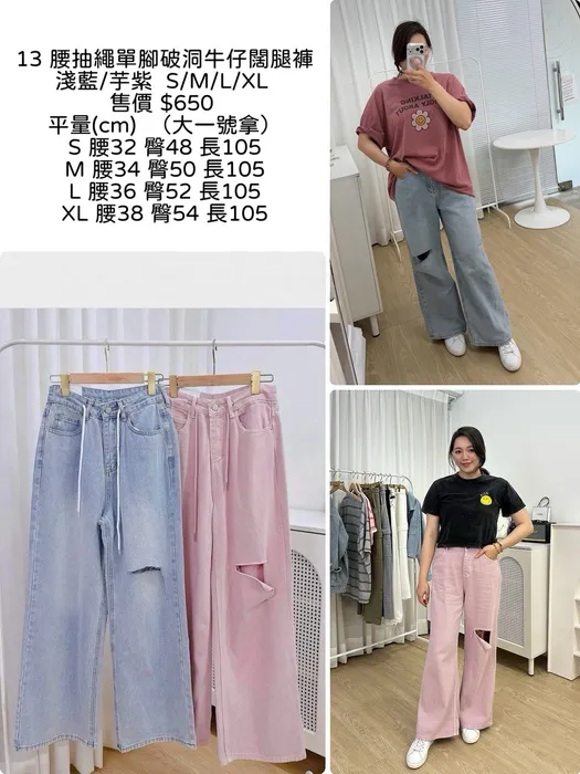 VI13腰抽繩單腳破洞牛仔闊腿褲